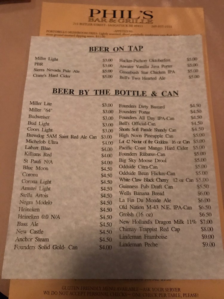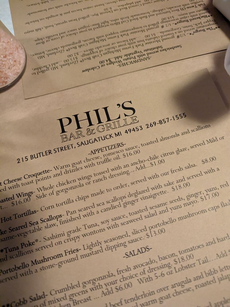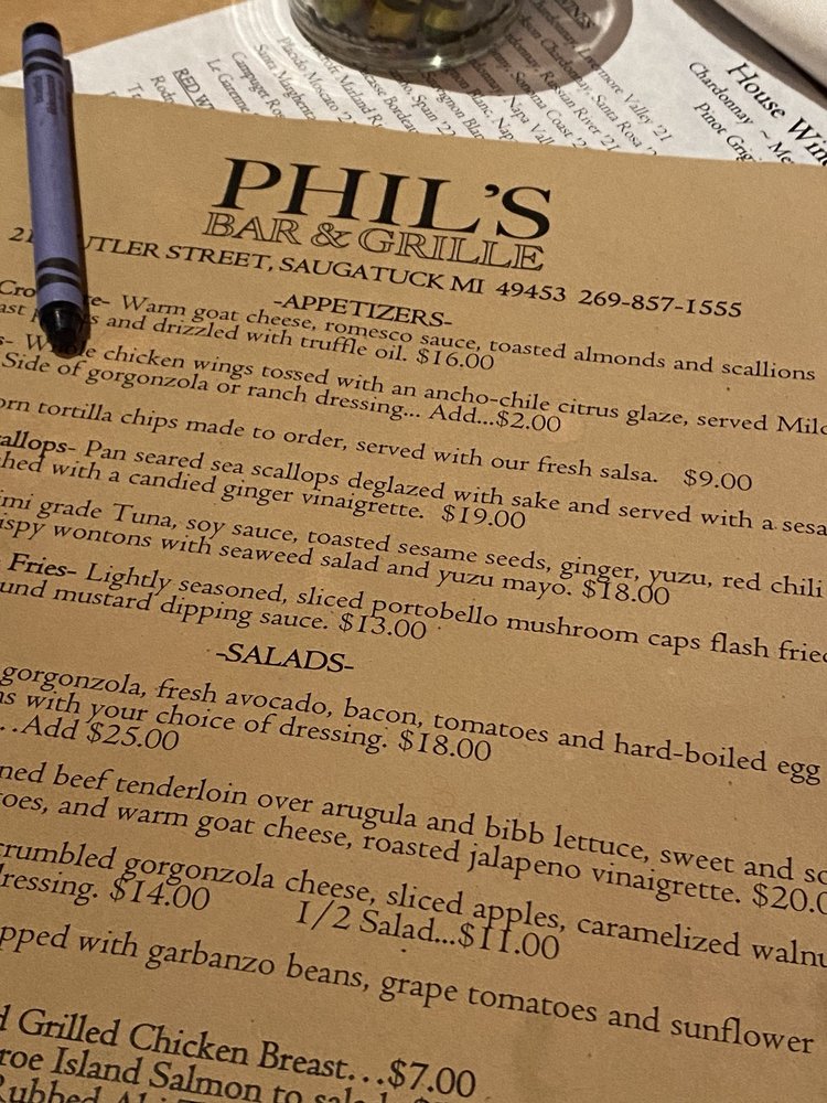 Phil's Bar & Grille is a popular New American bar located in Saugatuck, MI. With a wide range of amenities including outdoor seating, full bar, pool table, and happy hour specials, it's a go-to spot for locals and tourists alike. The menu boasts many vegetarian options and creative dishes like Chicken and Shrimp Gumbo, Goat Cheese Croquettes, and Crispy Chicken Sandwich. Customer reviews consistently praise the tasty food and attentive service, emphasizing the cozy yet lively atmosphere. Whether you're looking for a casual meal or a night out with friends, Phil's Bar & Grille has something for everyone. Don't miss the opportunity to experience the delicious flavors and inviting ambiance at this Saugatuck institution.